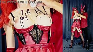 busty redhead mistress in latex dominates with strapon
